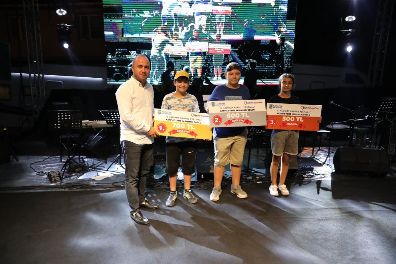 Tarım Kenti Silivri’de festival heyecanı tüm hızıyla devam ediyor. Silivri Belediyesi tarafından düzenlenen 11. Kadıköy Karpuz Festivali büyük bir coşkuyla gerçekleştirildi. Kadıköy Meydanı’nda yoğun bir katılımla yapılan festival kapsamında; hiçbir sulama yapılmadan, Kadıköy’ün benzersiz iklim özellikleriyle yetiştirilen Kadıköy Karpuzu için En İyi Karpuz Yarışması düzenlendi. Jüri üyeliğini; Ziraat Mühendisleri Aslı Uçman, Özkan Kartal ve Bülent Atabay’ın yaptığı yarışmaya 35 üretici katıldı. Yarışmada birinci olan Begüm Şılak tam altın, ikinci Ahmet Sayın yarım altın, üçüncü Sude İşkaçıran ise çeyrek altın ile ödüllendirildi. Ayrıca Silivri Ziraat Odası yarışmada dereceye girenlere para ödülü ve Anadolu Hastanesi checkup takdim etti. Çocukların katıldığı ve 20 yarışmacının yer aldığı Karpuz Yeme Yarışması’nda ise birinci olan Furkan Küçük 700 TL’lik kırtasiye çeki, ikinci Doruk Kaya 600 TL’lik kırtasiye çeki, üçüncü Irmak Yalın 500 TL’lik hediye çeki almaya hak kazandı. Festivalin sahne programlarında Yeni Nesil Gençlik ve Spor Kulübü’nün Silivri yöresi halk oyunları büyük beğeni toplarken, ünlü şarkıcı Lerzan Mutlu en güzel şarkılarıyla Silivrililere eğlence dolu bir gece yaşattı.
