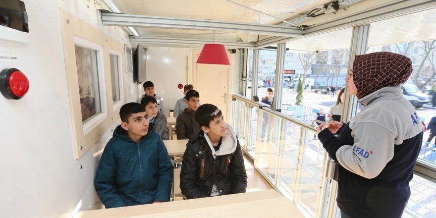 AFAD görevlisi Asiye Ak, öncelikle herkesin deprem çantası hazırlaması gerektiğinin altını çiziyor. Deprem çantasında nelerin bulunması gerektiğini öğrencilere tek tek anlatan Ak, çantanın çıkışa yakın bir yerde durması gerektiğini söylüyor. Depreme evde yakalanma olasılığına karşı, yatak ve koltuk yanları gibi evdeki güvenli noktaların belirlenmesi hayati önem taşıyor. Simülasyon tırında öğrencilerin okulda depreme yakalanmaları olasılığında yapılması gerekenler 6.5 şiddetindeki sarsıntıyla gösteriliyor. Görevliler öğrencileri, sarsıntı sona erene kadar sıranın yanında iki diz yerde olacak şekilde beklemek ve deprem bittiğinde sigorta ve vanaları kapatarak hızlıca okul bahçesine çıkılması yönünde uyarıyor.