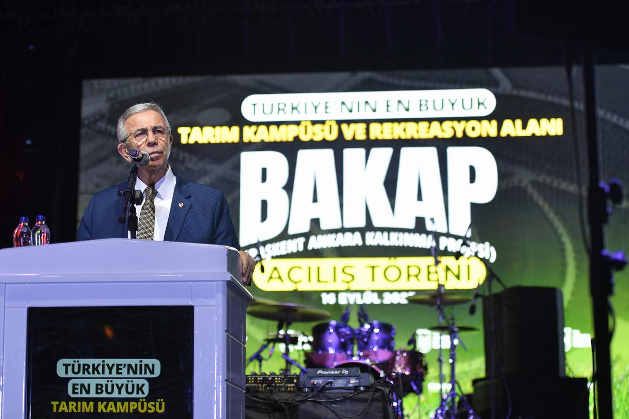BAKAP Tarım Kampüsü ve Rekreasyon Alanı’nı tıklım tıklım dolduran coşkulu kalabalığın alkışları eşliğinde eşi Nursen Yavaş ile birlikte sahneye çıkan Mansur Yavaş,“Şu anda açılışını yaptığımız alan tam 3,5 milyon metrekare… Türkiye’nin en büyük tarım kampüsü ve rekreasyon alanı… Cumhuriyetimizin 100. yılında, önümüzdeki yüzyıllara miras kalacağına inandığımız bu dev projeyi Ankara’ya armağan etmenin büyük mutluluğunu yaşıyoruz”diyerek konuşmasına başladı.