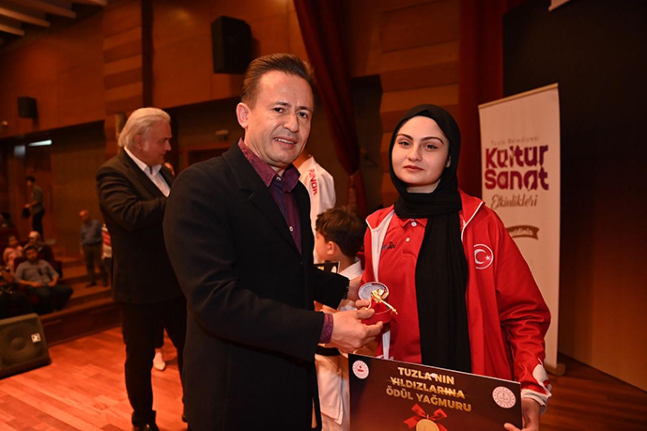 Tuzla Kaymakamlığı, Tuzla Belediyesi ve Tuzla İlçe Milli Eğitim Müdürlüğü işbirliğinde Tuzla’nın başarılı öğrencilerinin ödüllendirildiği ‘Tuzla’nın Yıldızlarına Ödül Yağmuru’ programının 7’incisi Tuzla Belediyesi Nikah Sarayı ve Kültür Merkezi’nde gerçekleştirildi. Koronavirüs salgını nedeniyle geçen yıl yapılmayan törende Tuzla’da okuyan ve Tuzla’yı ulusal ve uluslararası yarışmalarda temsil eden öğrencilere altın hediye edildi. Programda kültür, sanat, eğitim ve spor branşlarında başarılı ilkokul, ortaokul, lise ve özel eğitim kurumlarına giden 51 öğrenciye ödüllerini Tuzla Kaymakamı Ali Akça, Tuzla Belediye Başkanı Dr. Şadi Yazıcı ve Tuzla İlçe Milli Eğitim Müdürü Dr. Ahmet Alireisoğlu takdim etti. . Başarılı nedeniyle ödüllendirilen öğrenciler mutluluklarını dile getirdiler.