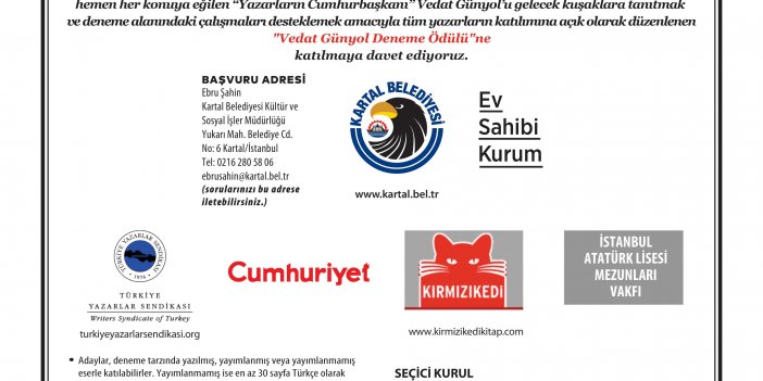 Kartal Belediyesi'nden yapılan açıklamada, başta edebiyat alanına giren sorunlar olmak üzere toplumsal yaşam içinde insanı ilgilendiren hemen her konuya eğilen ve “Yazarların Cumhurbaşkanı” diye anılan Vedat Günyol’u gelecek kuşaklara tanıtmak ve deneme alanındaki çalışmaları desteklemek amacıyla düzenlenen "Vedat Günyol Deneme Yarışması"na tüm yazarlarını katılımının beklendiği belirtildi.