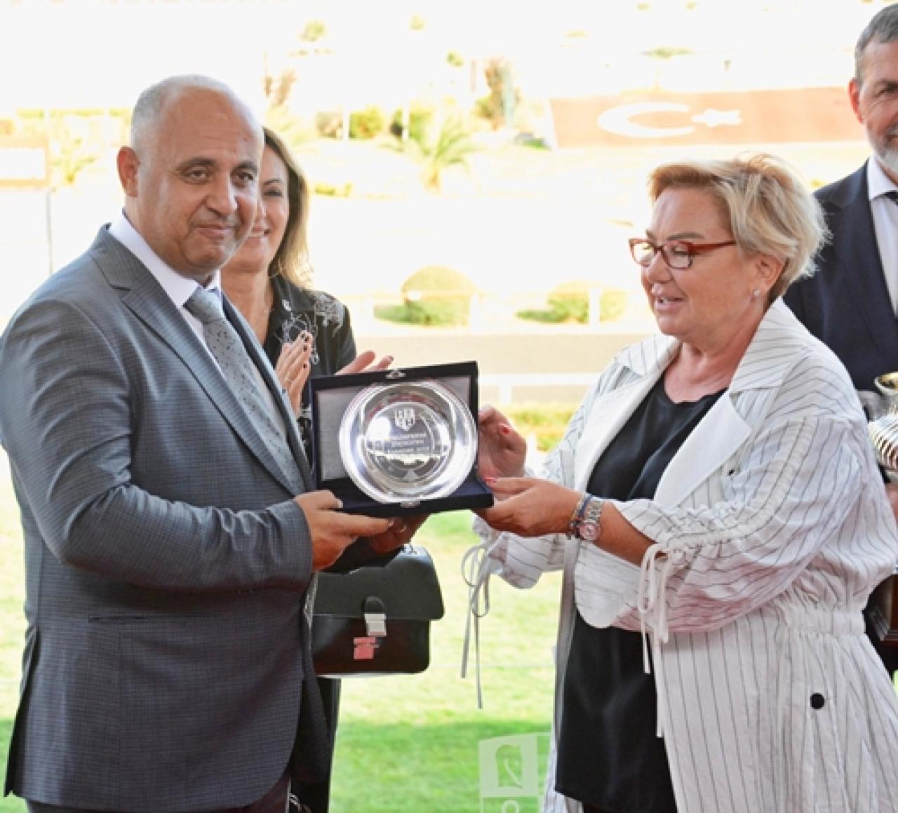 Yönetim Kurulu Üyemiz Gülnur Gülerce kazanan safkanın antrenörü Duran Tekeli'ye plaket takdiminde bulundu.