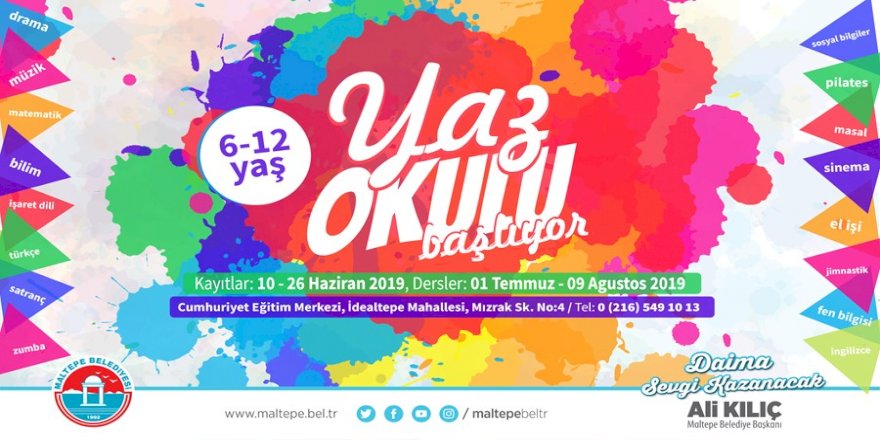 Maltepe Belediyesi, dramadan fen bilgisine, matematikten İngilizce’ye, sinemadan eğlenceli bilimlere, zumbadan jimnastiğe, müzikten el işlerine kadar bir dizi ders ve etkinliğin yer aldığı yaz okullarına start veriyor.Maltepe Belediyesi Kütüphane, Kurslar ve Eğitim Müdürlüğü, 1 Temmuz-9 Ağustos tarihleri arasında, okuma ve yazma bilen 6-12 yaş arasındaki çocuklara yönelik olarak yaz okulu düzenleyecek. Haftaiçi 09.00-17.00 saatleri arasında düzenlenecek kurslar arasında drama, matematik, Türkçe, Sosyal Bilgiler, Fen Bilgisi, İngilizce, işaret dili, el işi, müzik, sinema, eğlenceli bilim, satranç, masal atölyesi, zumba, pilates ve jimnastik yer alacak. Haftaiçi 2 gün Cumhuriyet Eğitim Merkezi, 2 gün bilim atölyesi ve Yalçın Kızılay Kapalı Spor Salonu’nda düzenlenecek yaz okulunda, Cuma günleri de çeşitli geziler gerçekleştirilecek. KAYITLAR 10-25 HAZİRAN ARASIYaz okuluna kayıtlar, kimlik fotokopisi, 1 fotoğraf, fatura veya ikametgâh ile öğrenciyi kurumdan alacak kişinin kimlik fotokopisiyle 10-25 Haziran tarihleri arasında Cumhuriyet Eğitim Merkezi’ne yapılacak. (29.05.2019)