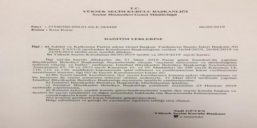 - Bir kısım sandık kurullarının ilçe seçim kurullarınca kanuna aykırı oluşturulması ve bu hususun da seçim sonucuna müessir olması nedeniyle, 31 Mart 2019 tarihinde yapılan İstanbul Büyükşehir Belediye Başkanlığı seçiminin iptaliyle yenilenmesine,