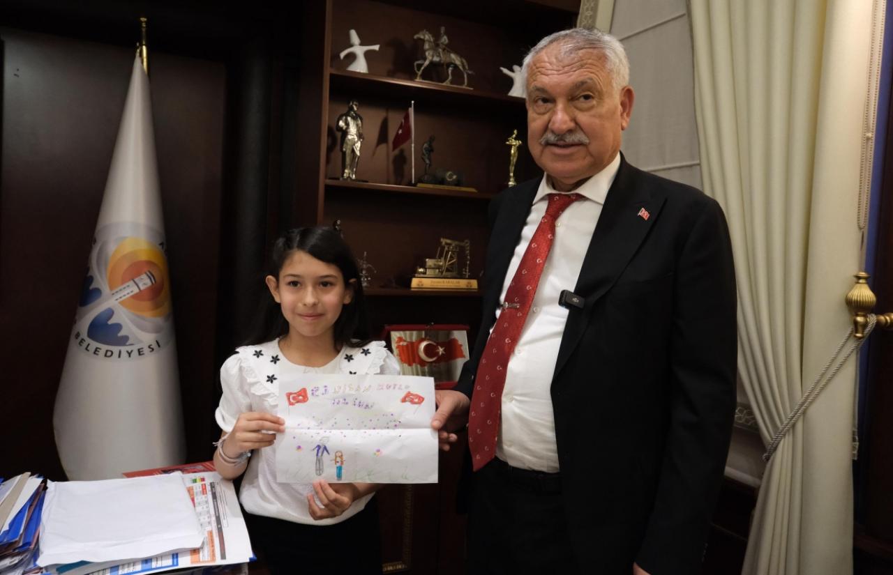 Başkan Zeydan Karalar, koltuğuna oturan Ezgi Neva Selçuk’açeşitli hediyeler verirken, Ezgi Neva Selçuk da Başkan Zeydan Karalar’a kendi yaptığıve üzerinde 23 Nisan Kutlu Olsun yazan resim hediye etti.