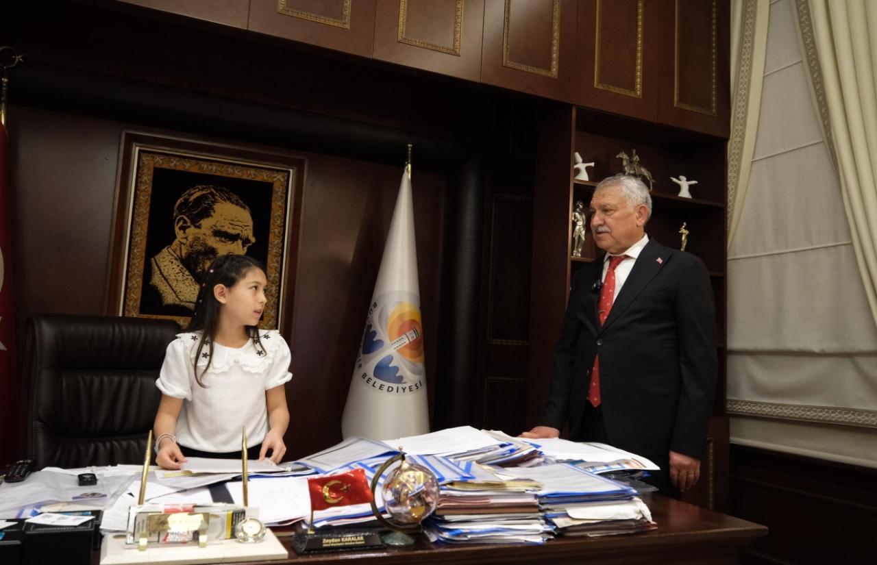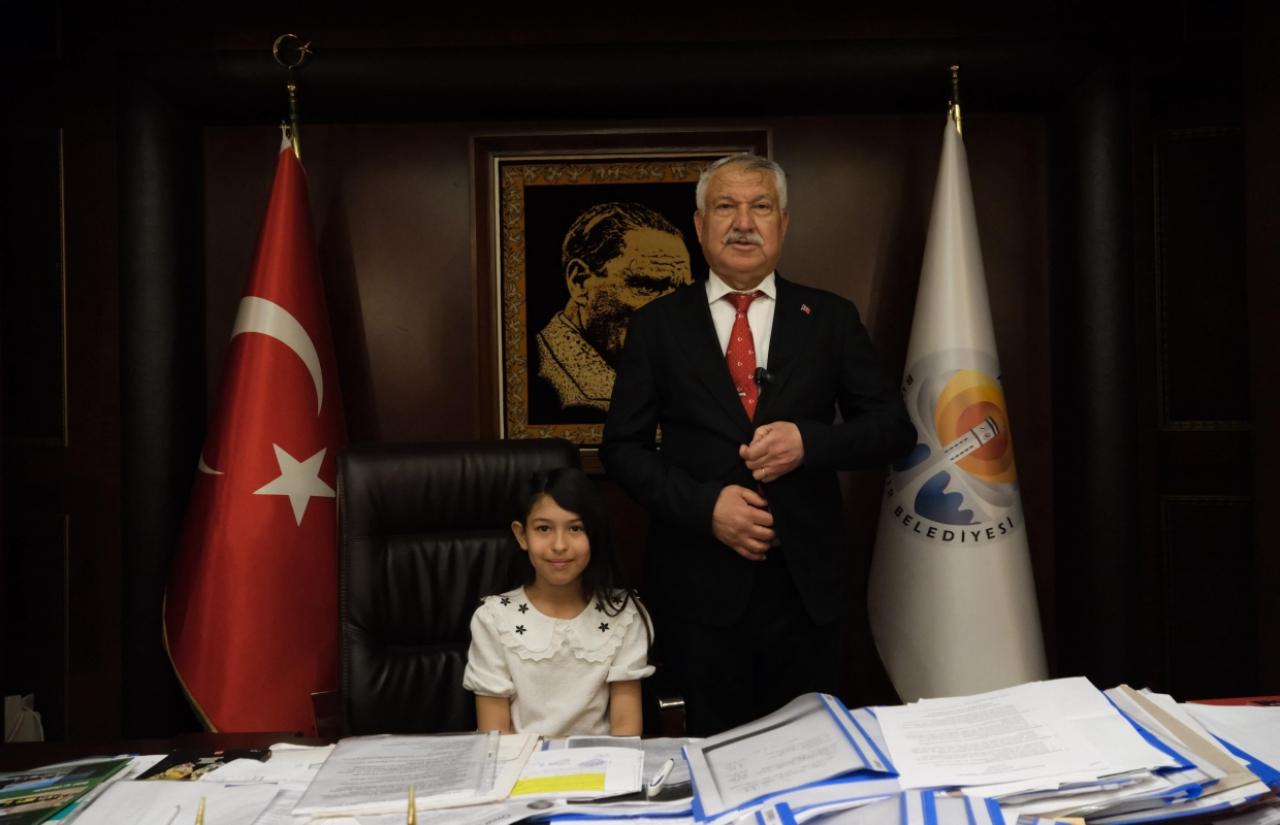 Başkan Zeydan Karalar’ın makamına oturan Ezgi Neva Salçuk’a;annesi Saniye Selçuk ve babası Sadık Selçuk ile İl Milli Eğitim MüdürYardımcısı Murat Bilal eşlik etti.