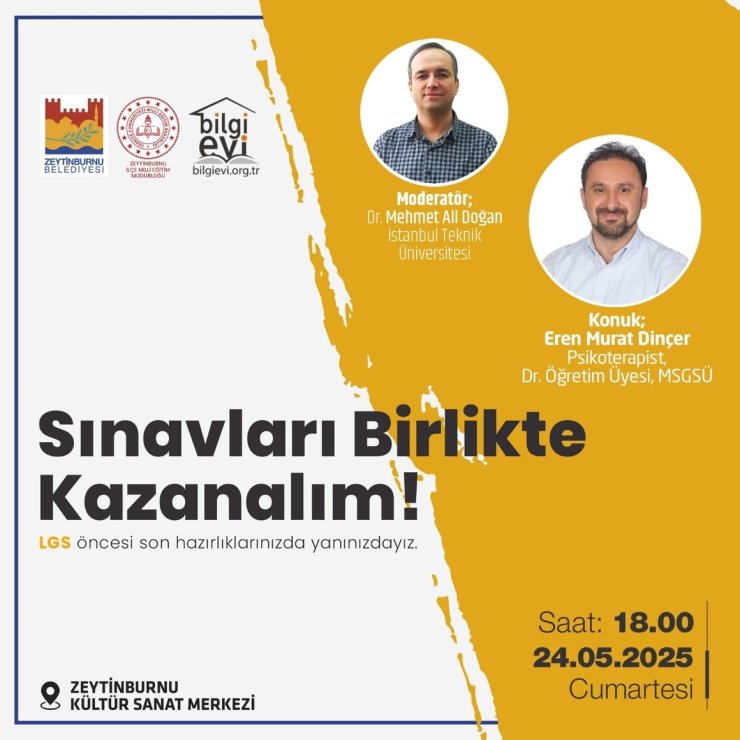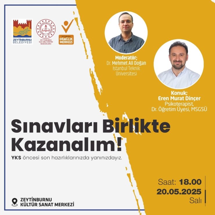 Yükseköğretim Kurumları Sınavı (YKS) ve Liselere Giriş Sınavı (LGS)'na günler kala öğrencilerdeki artan stres, endişe ve yanlış yapma kaygısının önüne geçmek adına uzmanlar eşliğinde program düzenleyen Zeytinburnu Gençlik Merkezi (ZEYGEM), akıllara takılan sorulara cevap buluyor. "Sınavları Birlikte Kazanlım" çağrısında bulunan ZEYGEM, konunun uzmanı üniversite hocalarıyla birlikte, Zeytinburnu Kültür ve Sanat Merkezi'nde seminerler düzenleyecek. 20 Haziran Salı günü saat 18.00'de gerçekleşecek YKS seminerine, Mimar Sinan Güzel Sanatlar Üniversitesi'nden Psikoterapist Dr. Öğretim Üyesi Eren Murat Dinçer konuk olarak katılacak. Programın moderatörlüğünü ise İstanbul Teknik Üniversitesi'nden Dr. Mehmet Ali Doğan üstlenecek. 24 Haziran Cumartesi günü saat 18.00'de ise LGS içerikli bir seminer düzenlenecek.